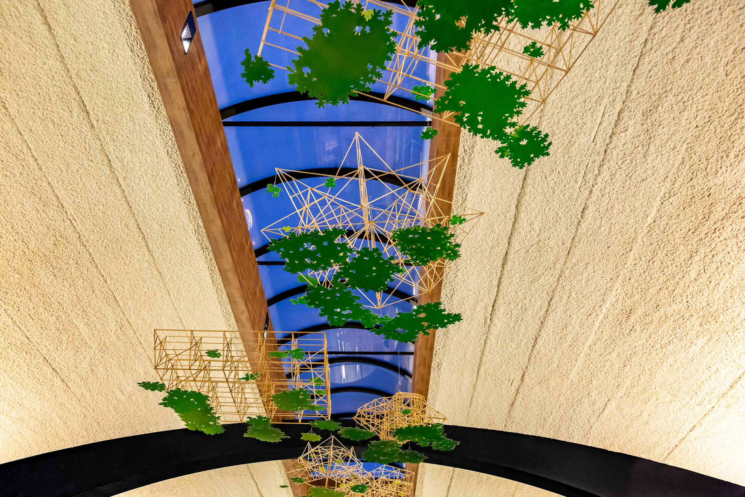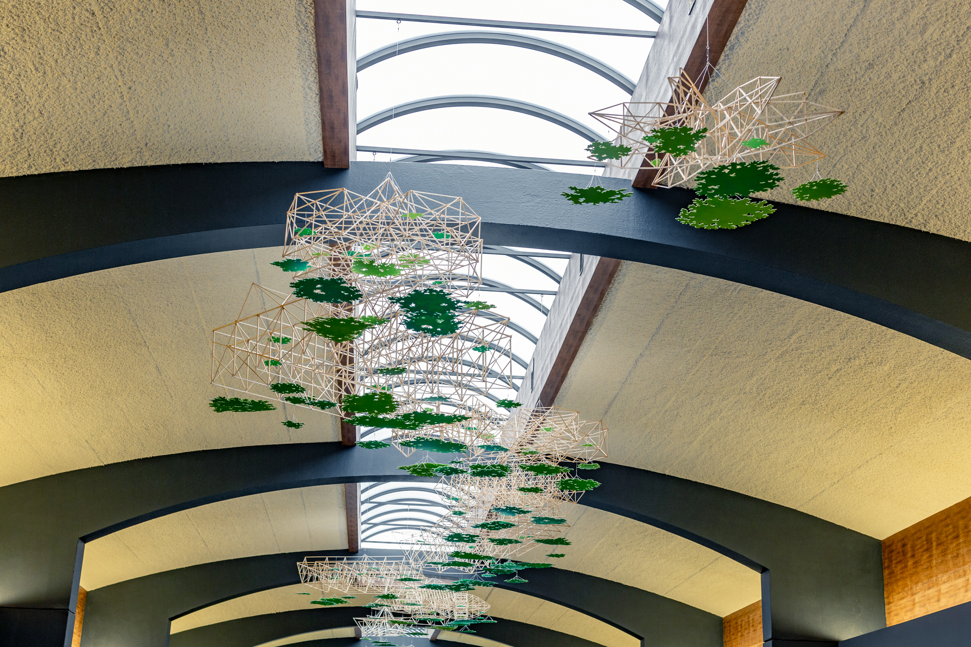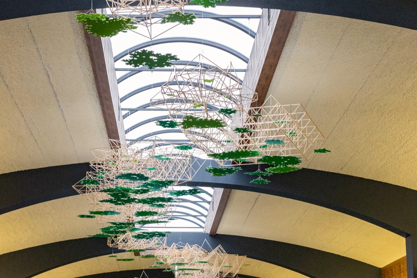 Shy Canopy is inspired by the act of looking up into a tree canopy and seeing the sunlight. Each of the 13 modules consists of a wooden structure with multiple elements that reference leaf clusters. The forms of the structure use historic regional bridges as a starting point, while the leaf cluster shapes suspended from them reference the leaves of White Oak and Sugar Maple – two of the Western Pennsylvania region’s most common trees. Both the spaceframes and the leaf clusters hang from swivels which allow them to turn, making the air currents visible and subtly changing the sculpture over time.