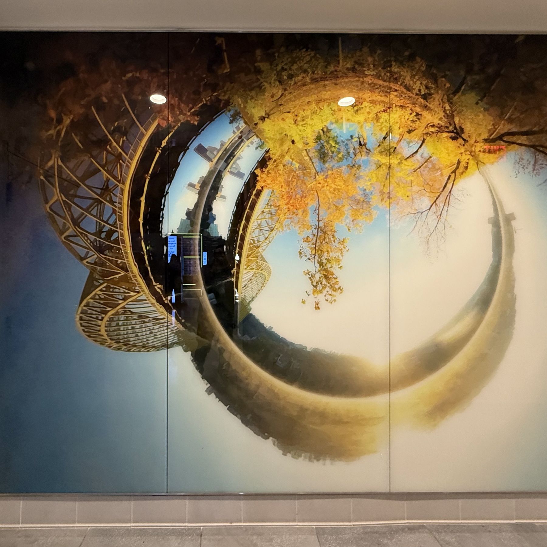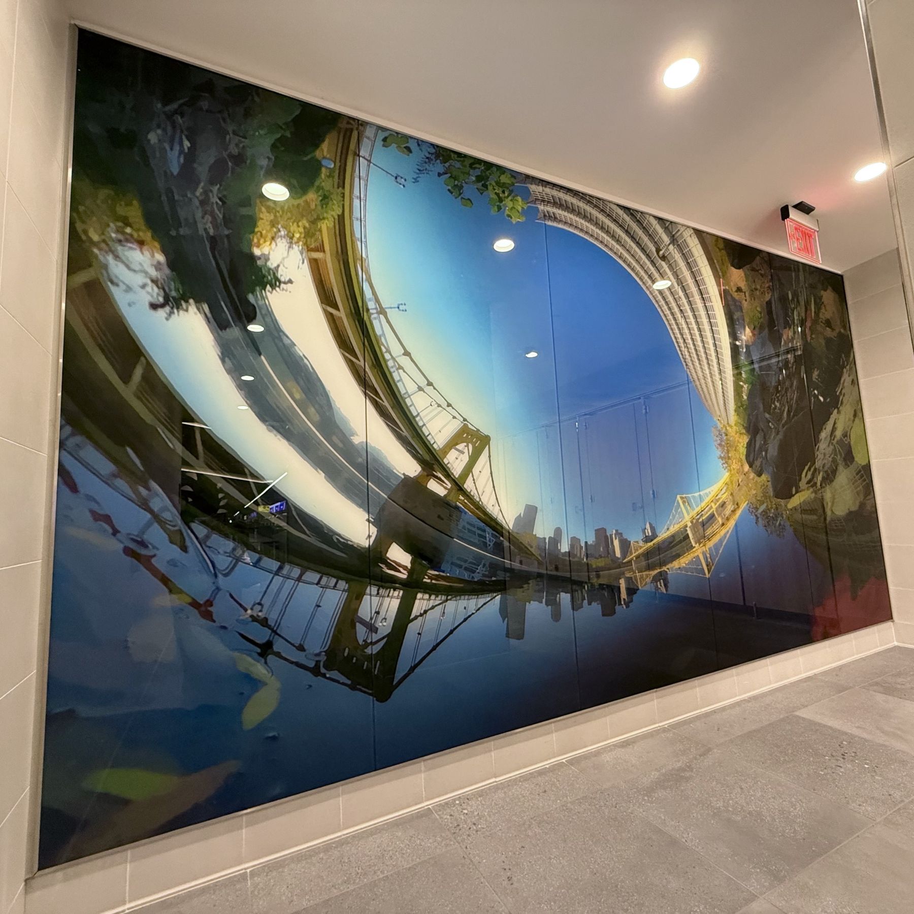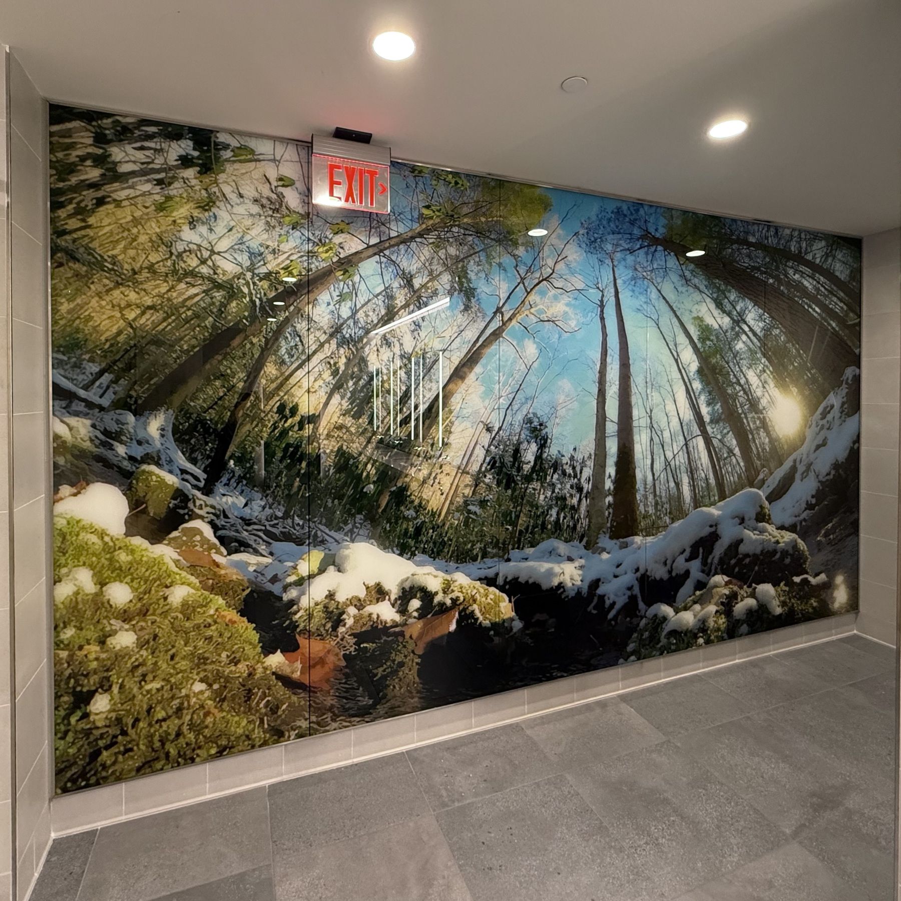 For the glass feature walls on the departures level, he focused on waterways of our region. He explored rivers, creeks, and runs, ultimately choosing views of four locations to highlight. In each of these images the camera was placed directly in the water. This creates a perspective very similar to, but slightly displaced from, the view one would have walking past on nearby trails. One can imagine looking down at a separate alien planet, but at the same time experience the feeling of being fully enveloped by a familiar place.