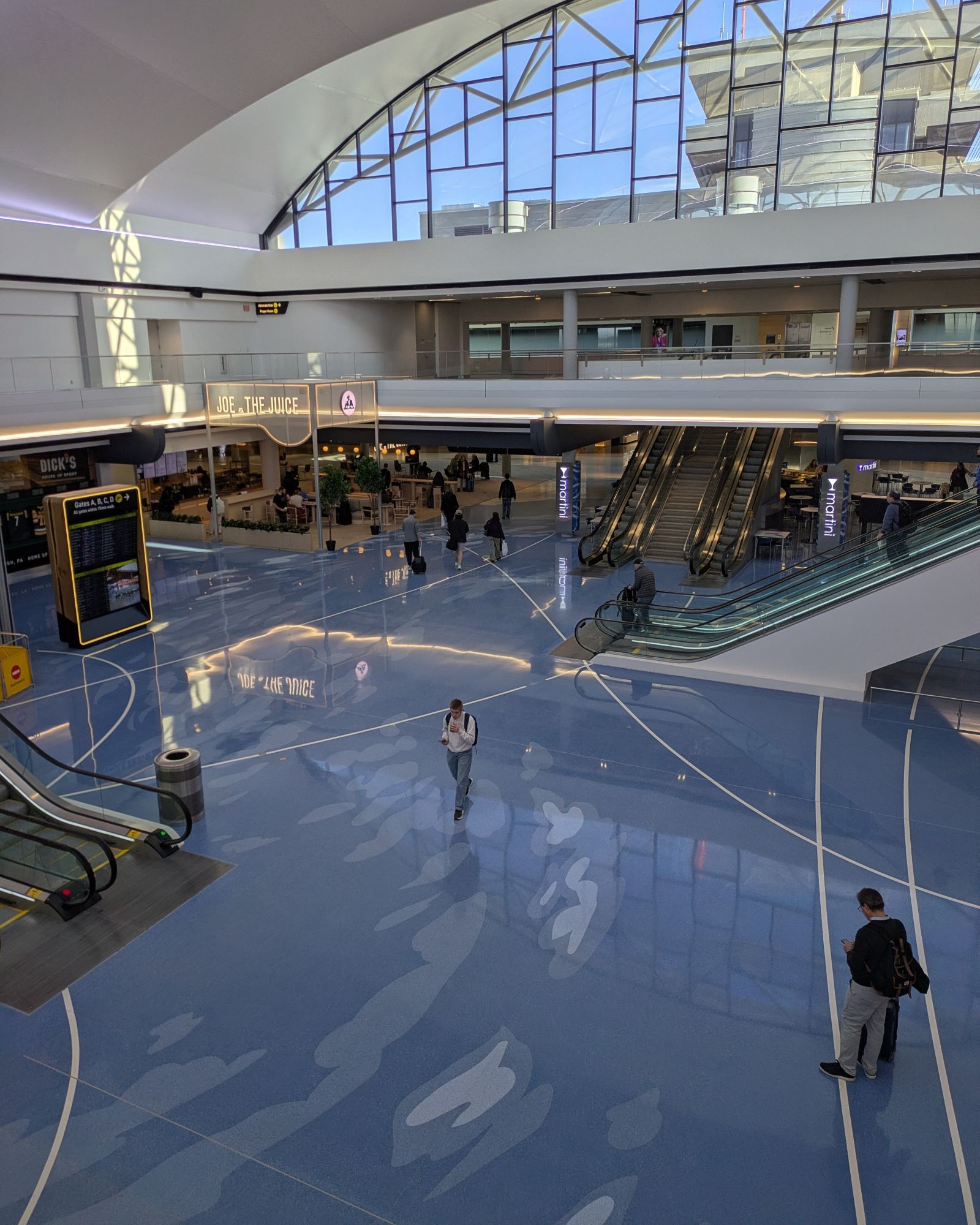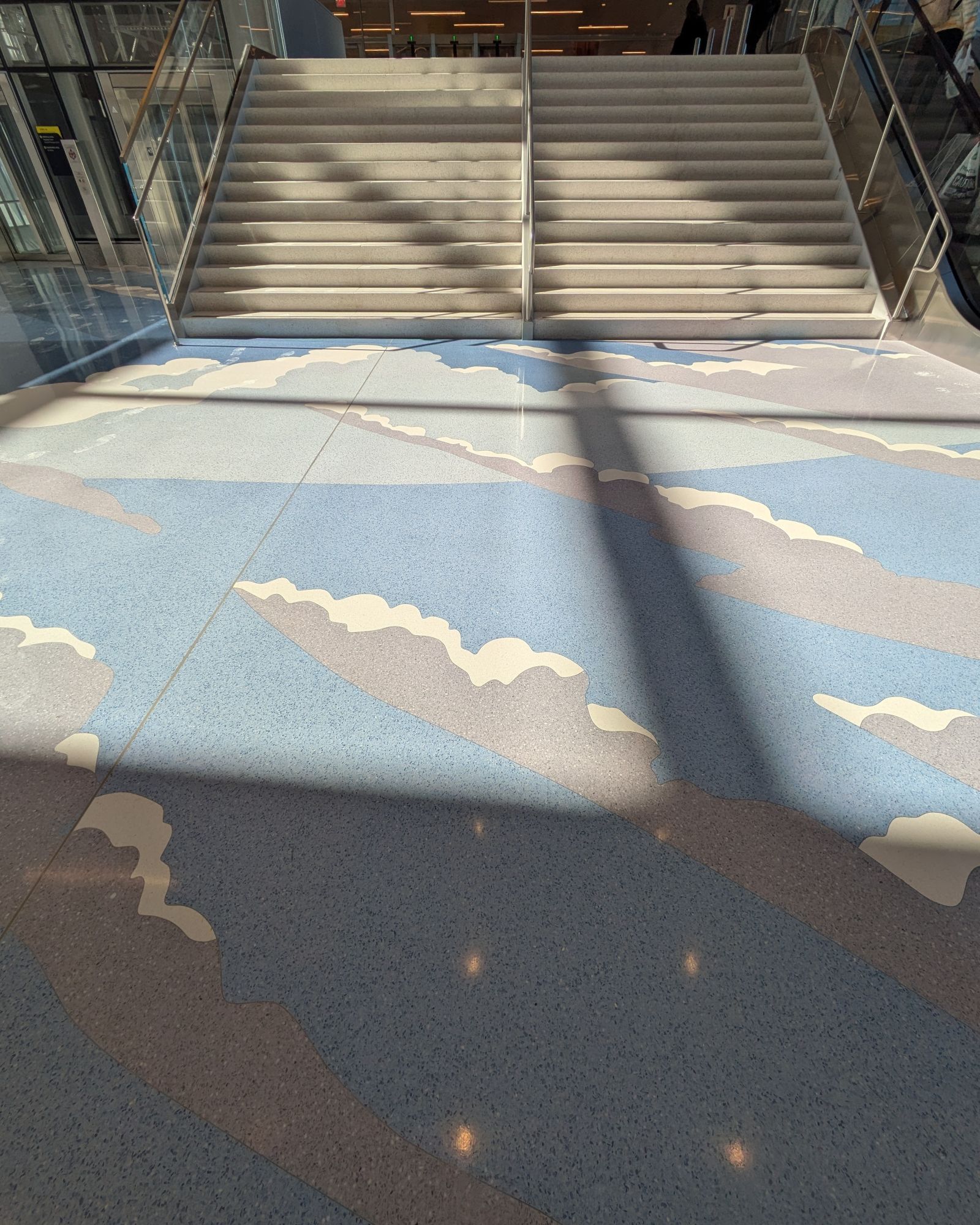 In 2025, Merrell expanded the floor design into the new terminal. As arriving passengers cross the threshold of the new building, they also cross a horizon line within the terrazzo floor, stepping from the sky onto a reflection of the sky, with clouds mirrored in the surface of the water.